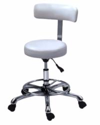 Taburete con respaldo y base cromada con ruedas.